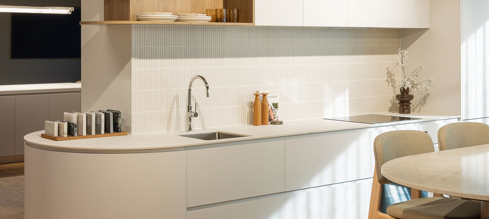 - 7 Curved Island Bench with Feature Shelving